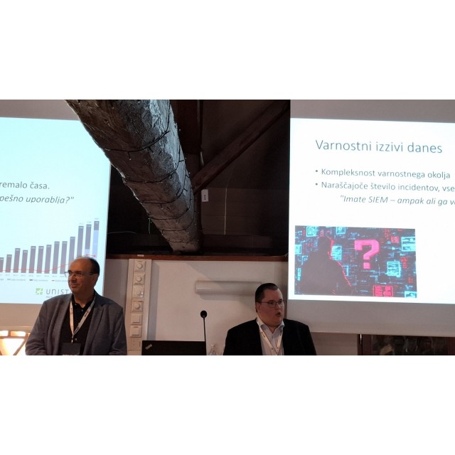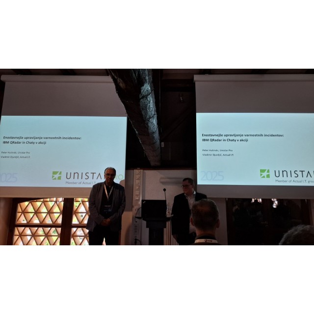 Na dogodku smo bili tudi mi – skupaj z ekipo Unistar smo prikazali, kako lahko z rešitvama IBM QRadar in našim AI pomočnikom Chatyjem bistveno poenostavimo upravljanje varnostnih incidentov v praksi. Naše predavanje z naslovom »QRadar in Chaty v akciji: enostavnejše upravljanje varnostnih incidentov«, ki sta ga izvedla Peter Hutinski (SOC manager) in Vladimir Djurdjič (vodja razvoja v ACTUAL I.T.), je pritegnilo veliko zanimanja med obiskovalci.